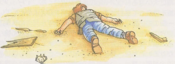 He had cut horizontally across the eye of one Rheboll and across the belly of another. Although the wounds weren't fatal, the two creatures lost their will to fight and began to writhing in agony on the beach. However, Adol was not able to remain fully conscious and, shuddering, collapsed.