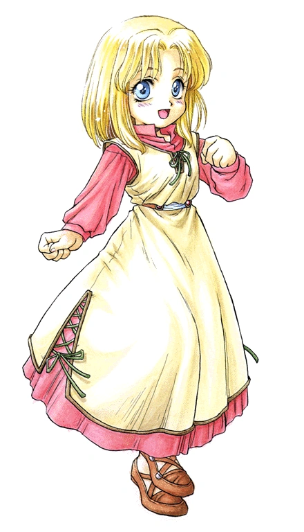 Unwilling to interrupt the flute’s tune, Adol paused before a door. At that moment, he heard a noise behind him. A young girl, still retaining a look of youthfulness, darted into the plaza.